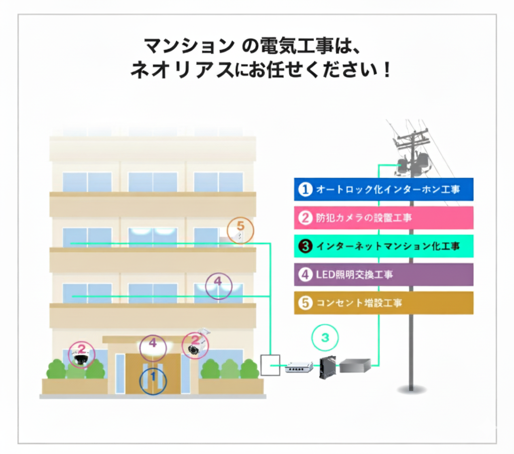 その他にもLED照明への交換工事やコンセント工事などのマンション、